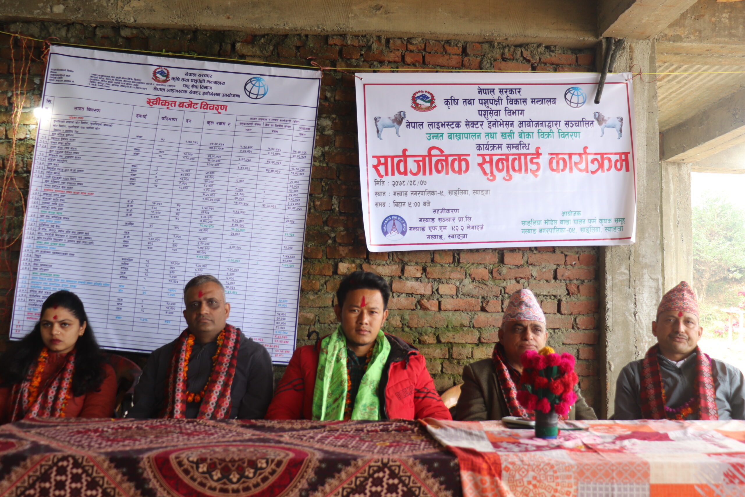 कार्यक्रमको सहजिकरण गल्याङ सञ्चार प्रा.लि. गल्याङ एफएम ९२.२ मेगाहर्जका तर्फबाट एफएमका स्टेशन म्यानेजर केपी खनालले गर्नुभएको थियो । आयोजना स्वीकृत भएपछि दुई पटक सार्बजनिक सुनुवाई गर्नुपर्ने प्रक्रिया अनुसार पहिलो पटक सार्बजनिक सुनुवाई कार्यक्रम गरिएको हो । आयोजना परेपछि बाख्रा पालन गरिरहेका स्थानीय कृषकहरु उत्साहित भएका छन् ।