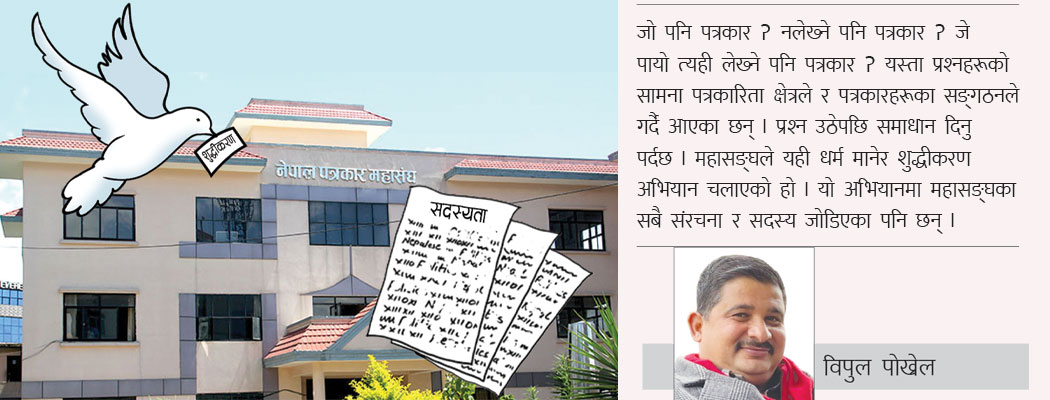 नेपाली पत्रकारको साझा संस्था नेपाल पत्रकार महासङ्घ नेपालको पुरानो संस्थाका रूपमा समेत चिनिन्छ । यो संस्थाको निश्चित लक्ष्य र उद्देश्य छन् । तीमध्ये पत्रकारिताको विश्वसनीयता अभिवृद्धि गर्न र आफूभित्रको सुधारका लागि अग्रसर हुनु पनि एक हो । यही क्रममा महासङ्घले अहिले सदस्यता शुद्धीकरणको अभियान नै थालेको छ । गत पुस ८ र ९ गते सुर्खेतमा सम्पन्न महासङ्घको केन्द्रीय साधारण सभाले सदस्यता शुद्धीकरणको सङ्कल्प गरेको थियो र त्यसलाई कार्यान्वयन गर्ने सन्दर्भमा आवश्यक निर्णयहरू पनि लिएको थियो । शुद्धीकरण मापदण्ड निर्माण गरेर केन्द्रीय समिति र लुम्बिनीमा सम्पन्न राष्ट्रिय मिडिया सम्मेलनले त्यो मापदण्डलाई अनुमोदन गरेपछि अहिले त्यो कार्यान्वयनको चरणमा छ । शुद्धीकरण मापदण्डको ७ नं. को बुँदामा भनिएको छ, ‘सदस्यता नवीकरणका लागि पत्रकारितामा निरन्तर संलग्न रहेको प्रमाण पेस गर्नुपर्ने प्रावधान रहेकाले सदस्य नवीकरण गर्दा पत्रकारिता क्षेत्रमा तीन वर्ष वा त्योभन्दा धेरै समयदेखि क्रियाशील नभएका व्यक्तिलाई स–सम्मान बिदाइ गर्ने र आवश्यक परेको अवस्थामा मानार्थ सदस्यतामा रूपान्तरण गर्न शाखा समितिले आवश्यक निर्णय लिने ।’ मापदण्डको एउटा मूलपक्ष यो हो । महासङ्घलाई क्रियाशील पत्रकारको संस्था बनाउने र पत्रकार महासङ्घमा विगतमा योगदान पु-याउनुभएका र हाल विभिन्न कारणले पत्रकारितामा योगदान दिन नसक्नु हुनेको हकमा उहाँहरूलाई स–सम्मान बिदाइ गर्ने भन्ने नै हो । पत्रकार महासङ्घको विधानमा साधारण सदस्य र मानार्थ सदस्यको व्यवस्था छ । त्यसरी सम्मान गर्नुपर्नेलाई विधान अन्तर्गत मानार्थ सदस्यता प्रदान गरेर परिवारकै सदस्यका रूपमा रहने अवसर पनि दिन सकिन्छ ।