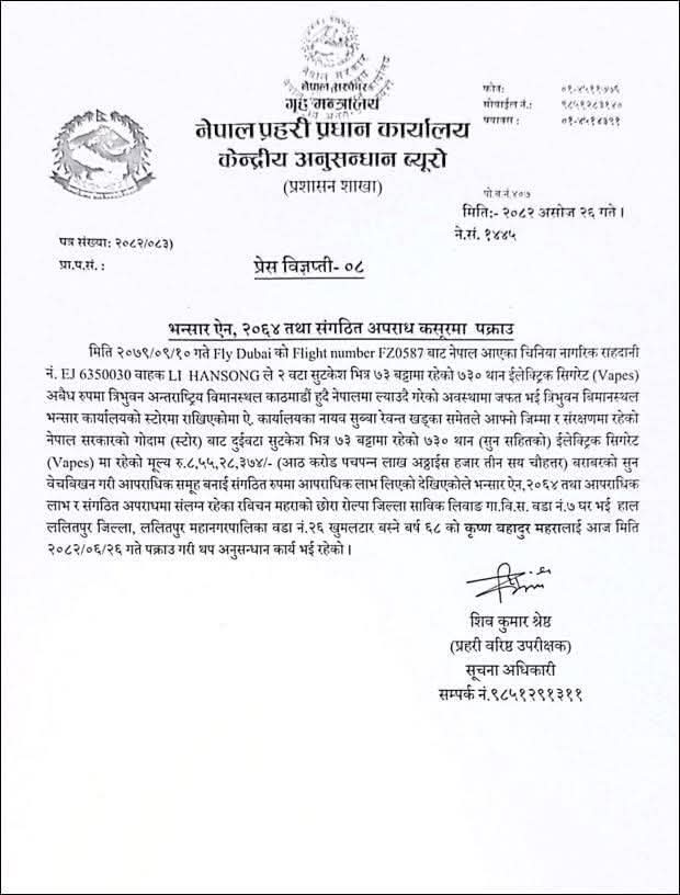 विज्ञप्तिमा विसं २०७९ पुष १० गते दुबईबाट नेपाल आएका चिनियाँ नागरिक ली हानसोङ्गले दुईवटा सुटकेसभित्र ७३ बट्टामा रहेको ७३० इलेक्टिक सिगरेट अवैध रूपमा त्रिभुवन विमानस्थल हुँदै नेपाल ल्याउँदै गरेको अवस्थामा जफत भएकामा त्यसलाई बेचबिखन गरी महराले लाभ लिएको आरोप छ ।