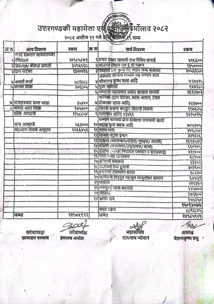 आम्दानीतर्फ रसिदबाट १ करोड ४९ लाख ८५ हजार ८७२, चेक तथा बैंकिङ प्रणालीबाट ३२ लाख ९६ हजार ९२८, दानपेटिकाबाट १३ लाख २० हजार ४१६, आरती कर्ताबाट ७ लाख ८१ ह्जार ४८८,कलश विक्रिबाट २ लाख १ हजार ८०५, स्टल विक्रिबाट ३५ हजार ४००, चामल आटा विक्रिबाट १ लाख ७५ हजार ७००,बाँकी आम्दानी ११ लाख ५८ हजार ८५४, अन्य आम्दानी ५ लाख ६३ हजार, शालग्राम विशेष अनुदान १४ लाख ६६ हजार ४५९ गरी २ करोड २९ लाख ८५ हजार ९२२ आम्दानी भएको हो । जसमा आम्दानी मध्ये १ करोड ५० लाख ९४ हजार ७७ रुपैँया खर्च गरी ८८ लाख ९१ हजार ८४५ रुपैँया बचत भएको शनिबार पत्रकार सम्मेलन गरी जानकारी दिईएको हो ।