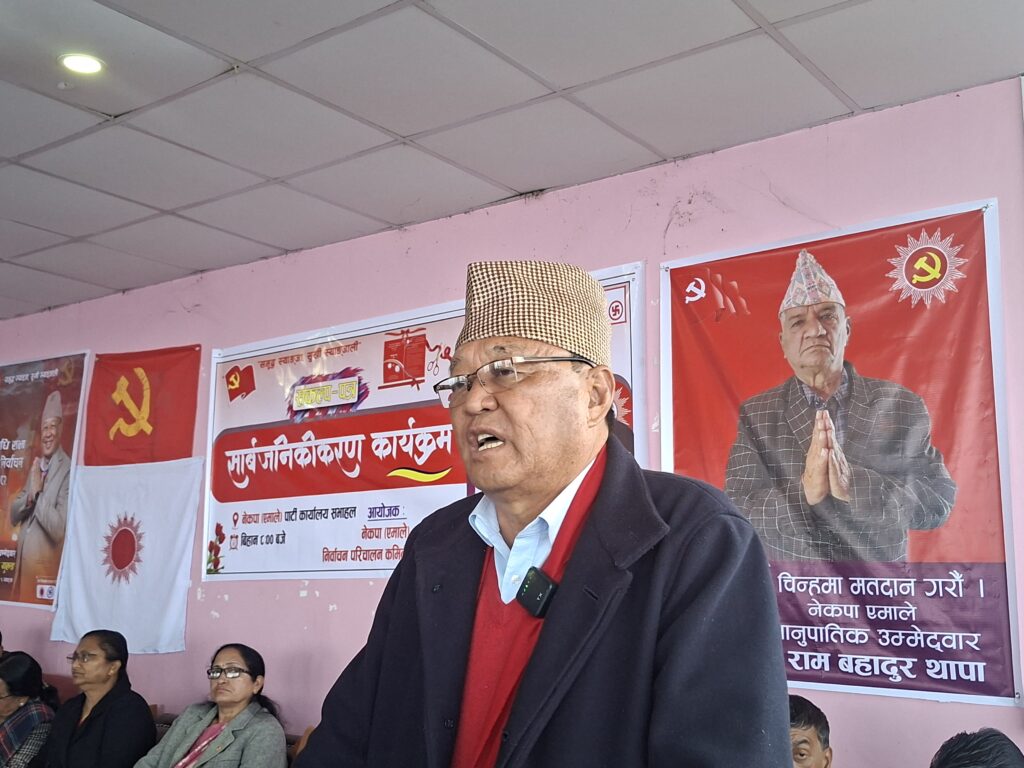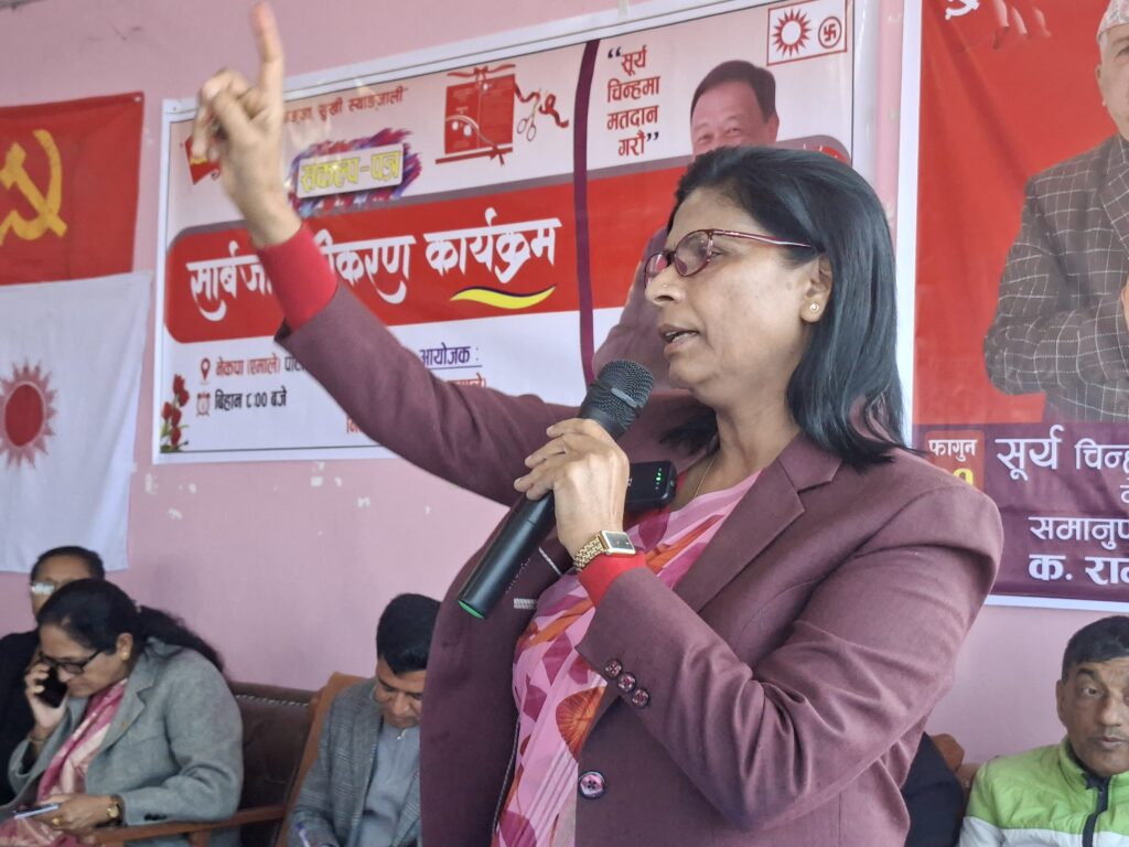 अहिले कस्ले जित्ने भन्दा पनि देशै रशनेकी नरहने भन्ने अवस्था भएकाेेले देशलाई सहि मार्गमा हिडाउन एमाले उम्मेदवारलाई बिजयी बनाउन सूर्य चिन्हमा मतदान गर्न आग्रह गर्नुभयाे ।